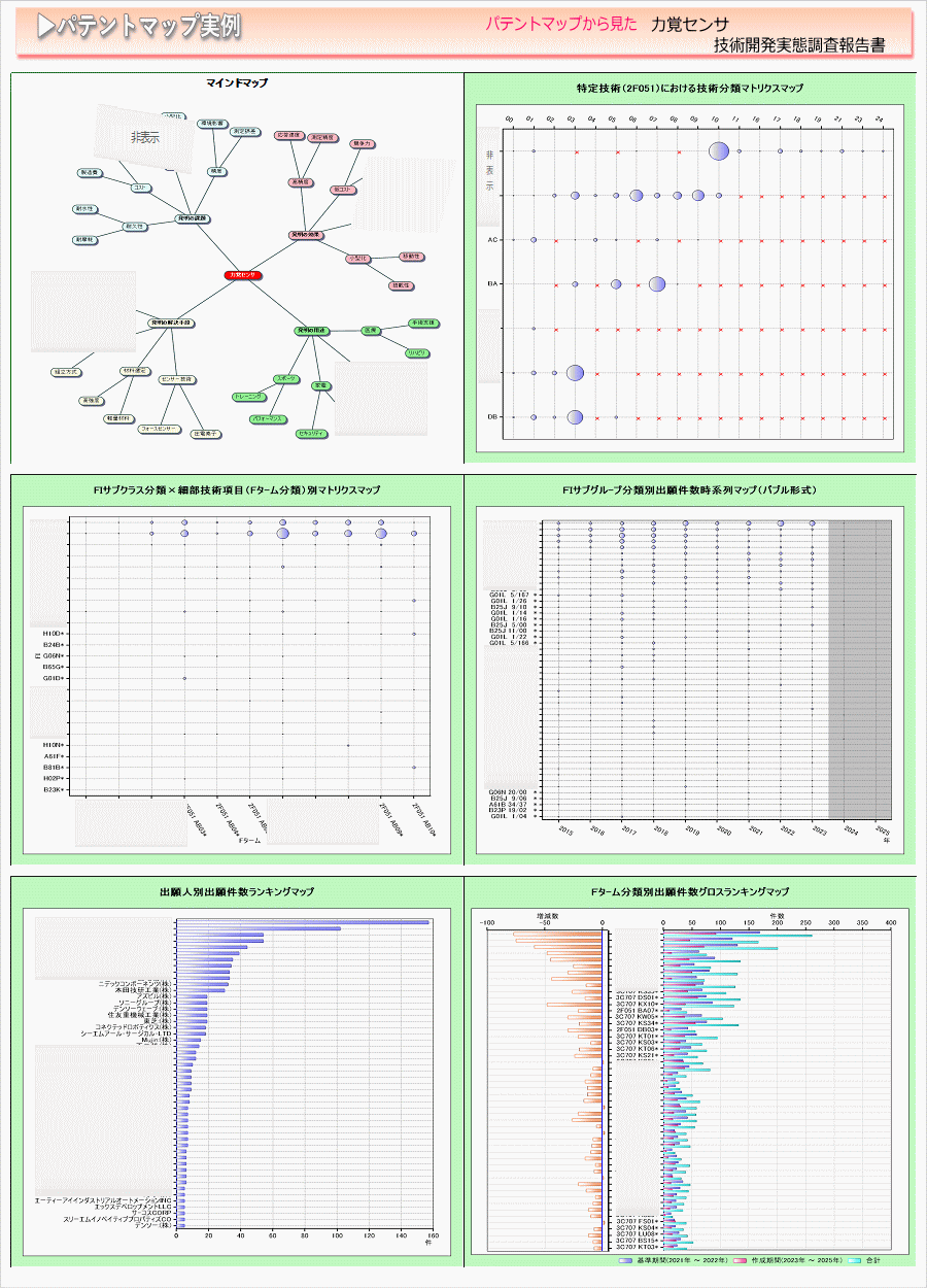 「力覚センサ」に関する出願件数、出願人(共同出願人)、発明者、特許分類などに対し、ランキング、時系列推移、技術分布図など様々な観点から分析したパテントマップを作成し、技術開発の実態を把握し今後の開発の指針決定に役立てようとするものである。