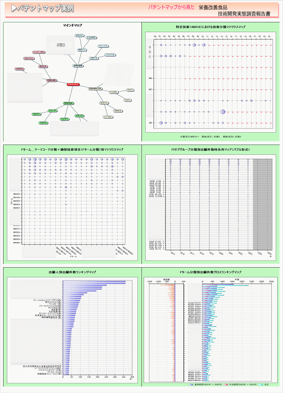 「栄養改善食品」に関する出願件数、出願人(共同出願人)、特許分類などに対し、ランキング、時系列推移、技術分布図など様々な観点から分析したパテントマップを作成し、技術開発の実態を把握し今後の開発の指針決定に役立てようとするものである。