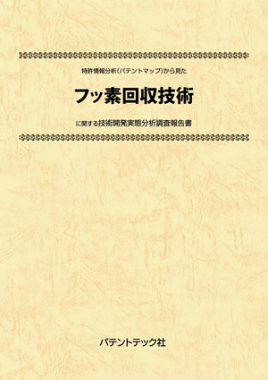 「フッ素回収技術」に関する出願件数、出願人(共同出願人)特許分類などに対し、ランキング、時系列推移、技術分布図など様々な観点から分析したパテントマップを作成し、技術開発の実態を把握し今後の開発の指針決定に役立てようとするものである。