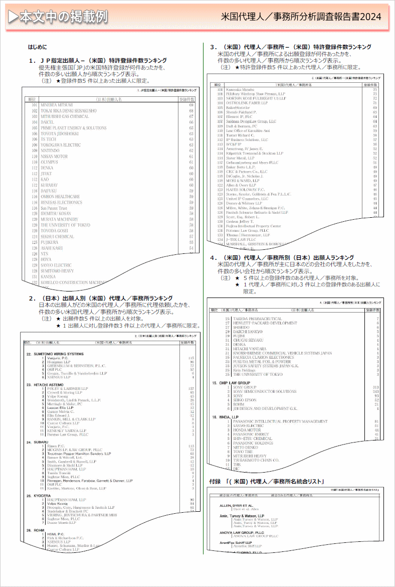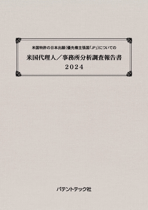 この「米国代理人/事務所分析調査報告書2024」(優先権主張国「JP」に限定)は、2024年に発行された