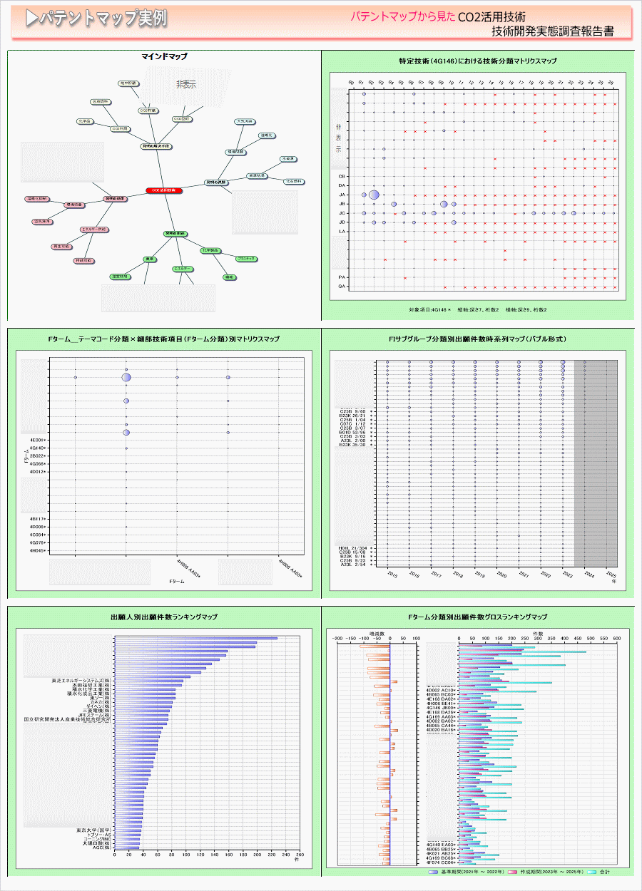 「CO2活用技術」に関する出願件数、出願人(共同出願人)特許分類などに対し、ランキング、時系列推移、技術分布図など様々な観点から分析したパテントマップを作成し、技術開発の実態を把握し今後の開発の指針決定に役立てようとするものである。