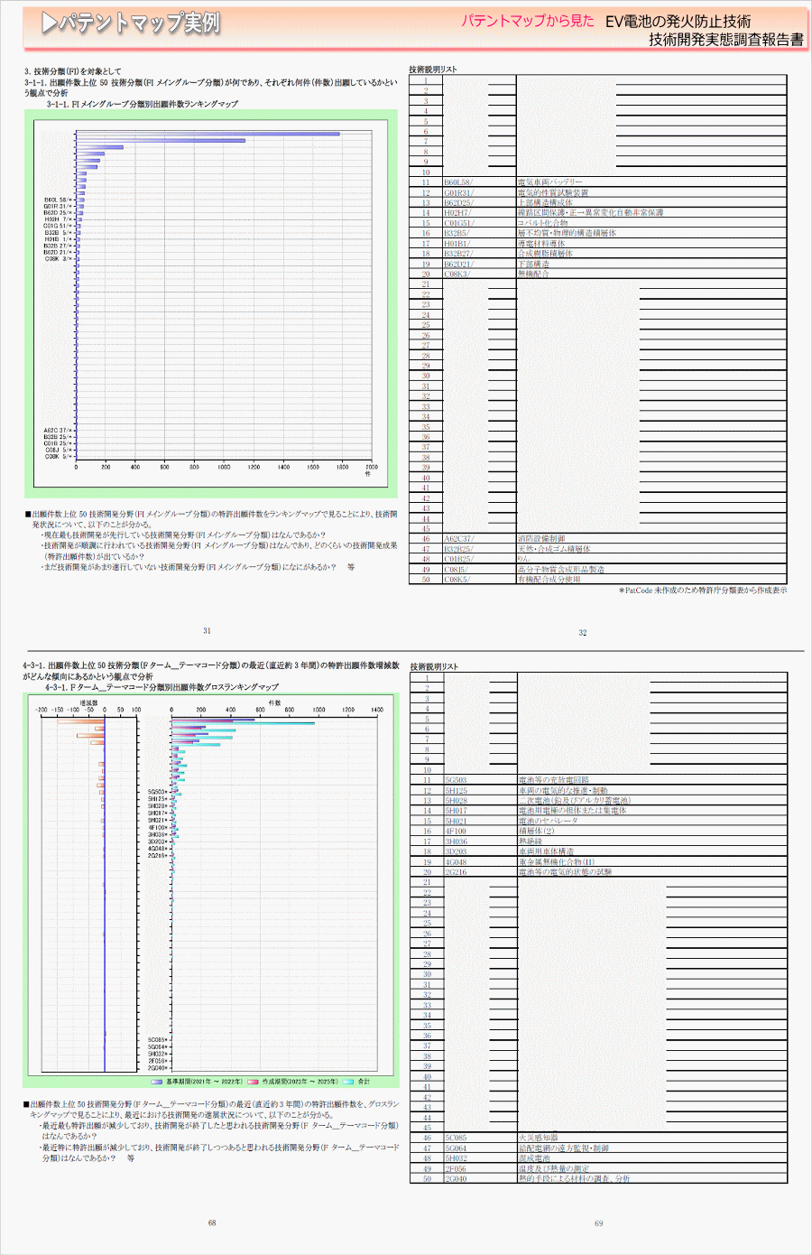 「EV電池の発火防止技術」に関する出願件数、出願人(共同出願人)特許分類などに対し、ランキング、時系列推移、技術分布図など様々な観点から分析したパテントマップを作成し、技術開発の実態を把握し今後の開発の指針決定に役立てようとするものである。