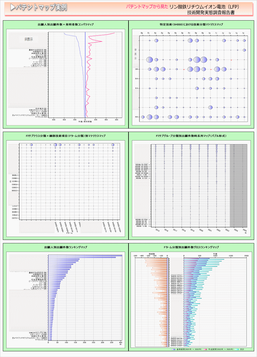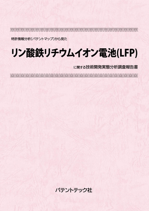 「リン酸鉄リチウムイオン電池(LFP)」に関する出願件数、出願人(共同出願人)、特許分類などに対し、ランキング、時系列推移、技術分布図など様々な観点から分析したパテントマップを作成し、技術開発の実態を把握し今後の開発の指針決定に役立てようとするものである。