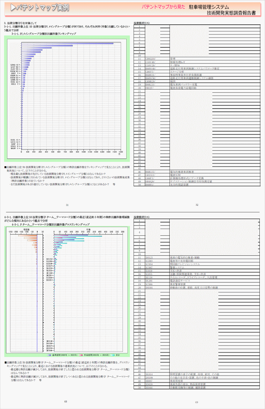 「駐車場管理システム」に関する出願件数、出願人(共同出願人)、特許分類などに対し、ランキング、時系列推移、技術分布図など様々な観点から分析したパテントマップを作成し、技術開発の実態を把握し今後の開発の指針決定に役立てようとするものである。
