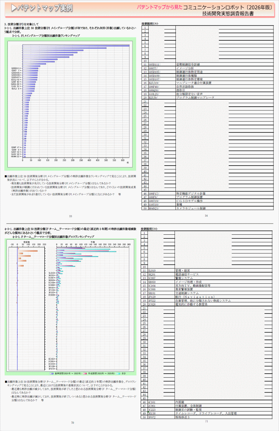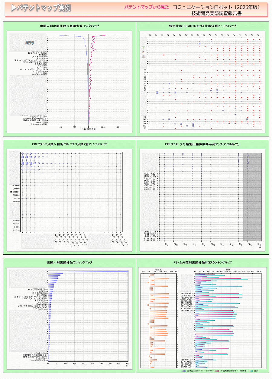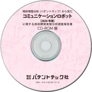 「コミュニケーションロボット」に関する出願件数、出願人(共同出願人)、特許分類などに対し、ランキング、時系列推移、技術分布図など様々な観点から分析したパテントマップを作成し、技術開発の実態を把握し今後の開発の指針決定に役立てようとするものである。