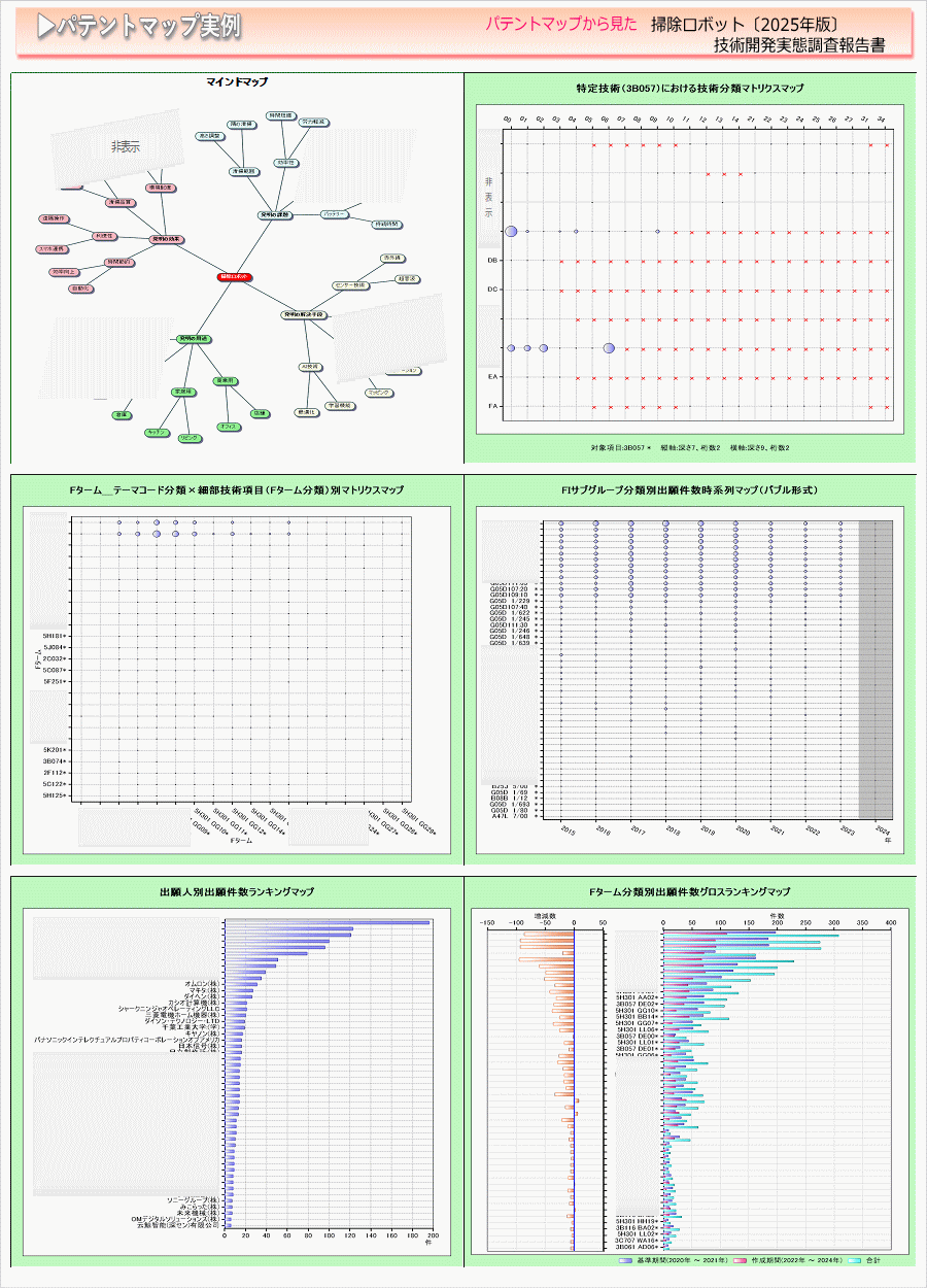 「掃除ロボット」に関する出願件数、出願人(共同出願人)、発明者、特許分類などに対し、ランキング、時系列推移、技術分布図など様々な観点から分析したパテントマップを作成し、技術開発の実態を把握し今後の開発の指針決定に役立てようとするものである。