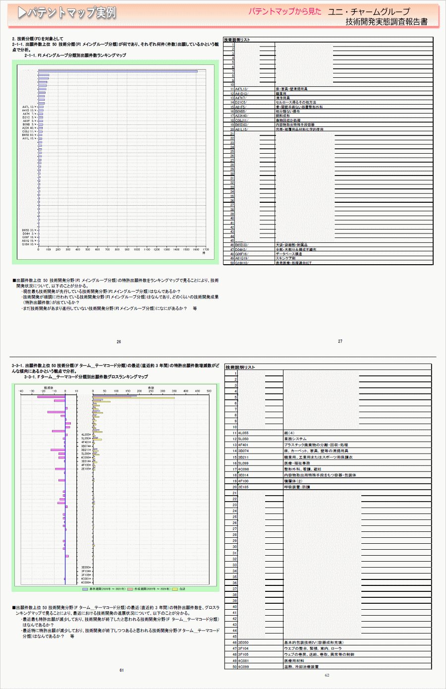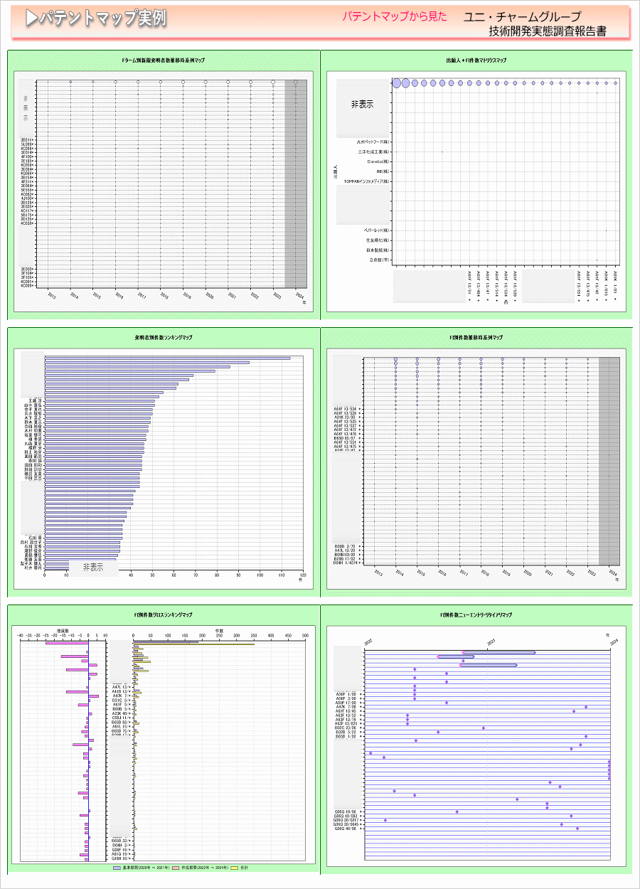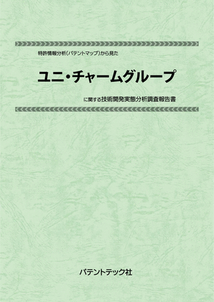「ユニ・チャームグループ」に関する出願件数、出願人(共同出願人)、発明者、特許分類などに対し、ランキング、時系列推移、技術分布図など様々な観点から分析したパテントマップを作成し、技術開発の実態を把握し今後の開発の指針決定に役立てようとするものである。