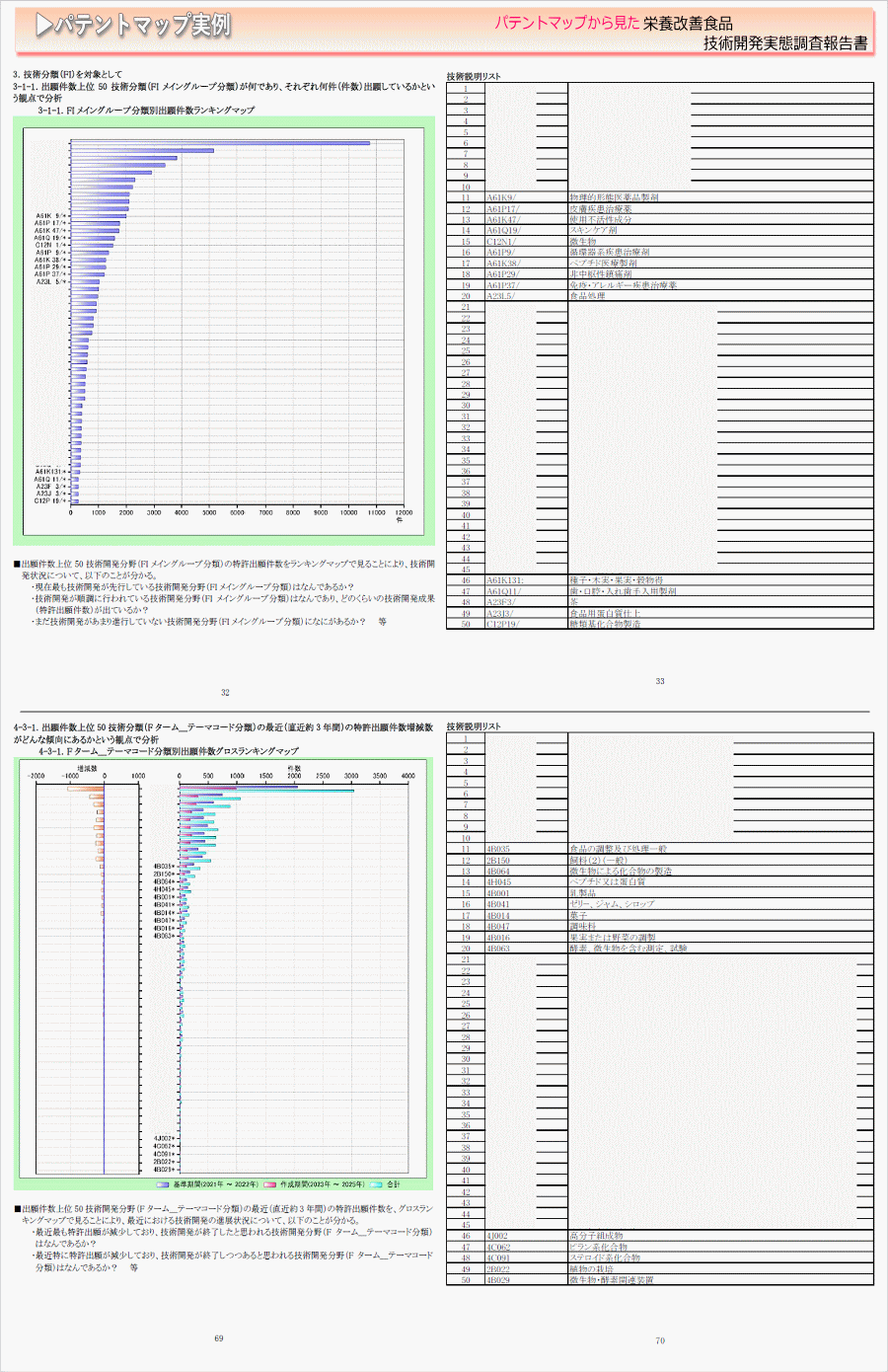 「栄養改善食品」に関する出願件数、出願人(共同出願人)、特許分類などに対し、ランキング、時系列推移、技術分布図など様々な観点から分析したパテントマップを作成し、技術開発の実態を把握し今後の開発の指針決定に役立てようとするものである。