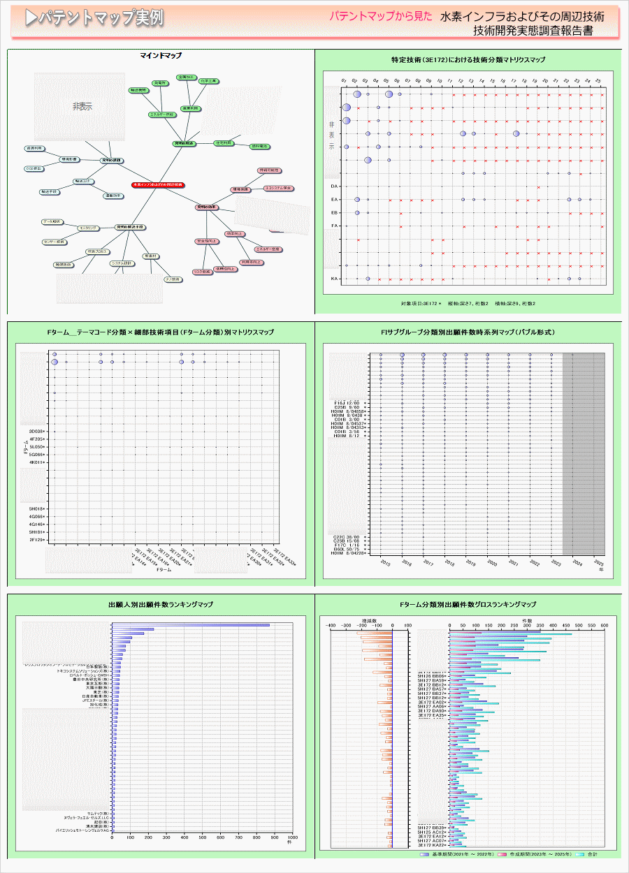 「水素インフラおよびその周辺技術」に関する出願件数、出願人(共同出願人)特許分類などに対し、ランキング、時系列推移、技術分布図など様々な観点から分析したパテントマップを作成し、技術開発の実態を把握し今後の開発の指針決定に役立てようとするものである。