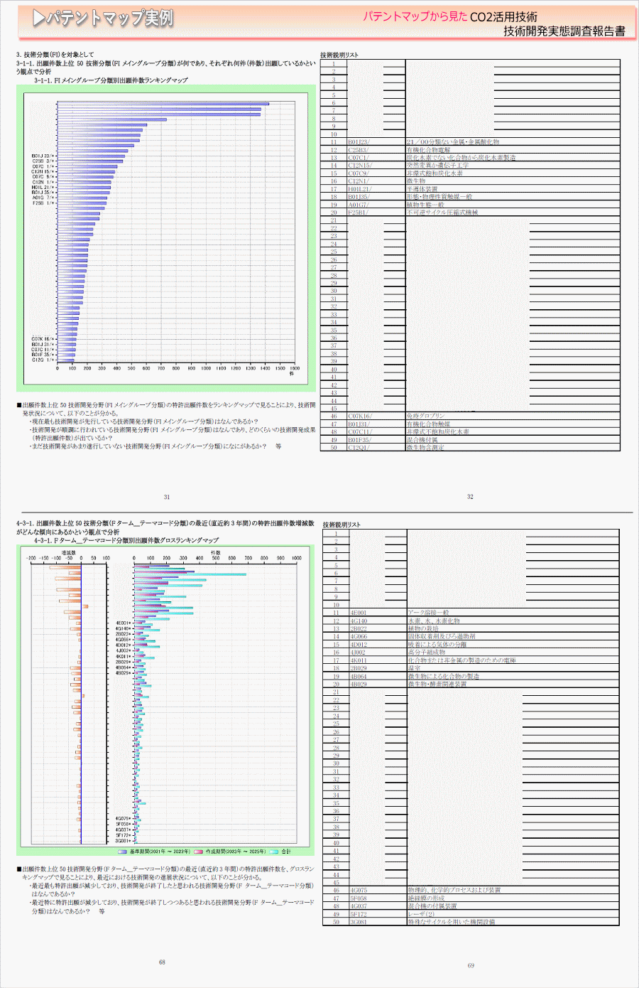 「CO2活用技術」に関する出願件数、出願人(共同出願人)特許分類などに対し、ランキング、時系列推移、技術分布図など様々な観点から分析したパテントマップを作成し、技術開発の実態を把握し今後の開発の指針決定に役立てようとするものである。