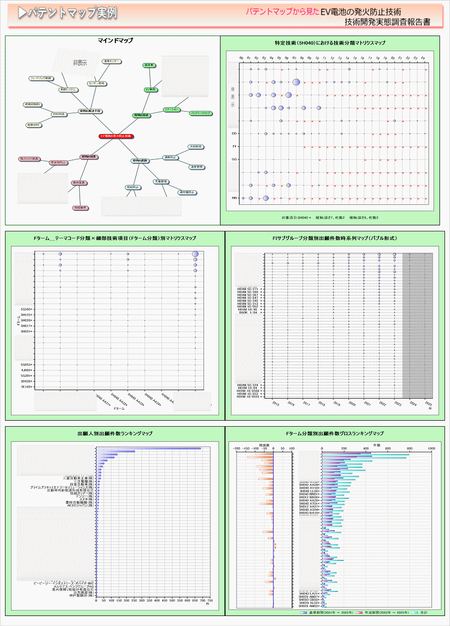 「EV電池の発火防止技術」に関する出願件数、出願人(共同出願人)特許分類などに対し、ランキング、時系列推移、技術分布図など様々な観点から分析したパテントマップを作成し、技術開発の実態を把握し今後の開発の指針決定に役立てようとするものである。