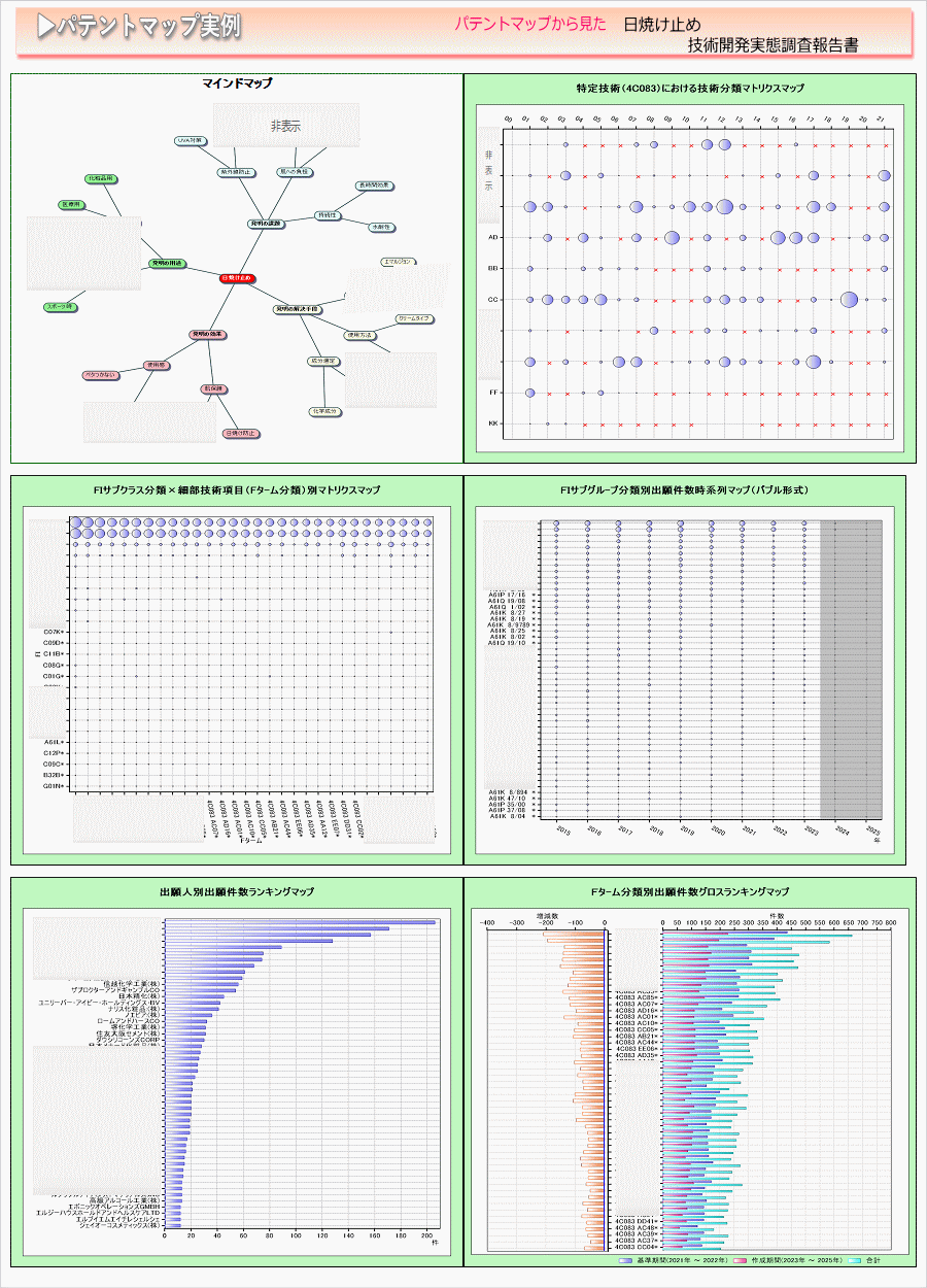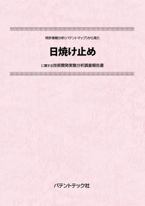 「日焼け止め」に関する出願件数、出願人(共同出願人)、特許分類などに対し、ランキング、時系列推移、技術分布図など様々な観点から分析したパテントマップを作成し、技術開発の実態を把握し今後の開発の指針決定に役立てようとするものである。
