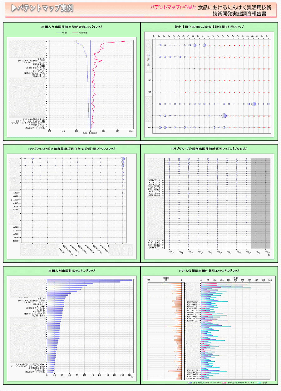 「食品におけるたんぱく質活用技術」に関する出願件数、出願人(共同出願人)特許分類などに対し、ランキング、時系列推移、技術分布図など様々な観点から分析したパテントマップを作成し、技術開発の実態を把握し今後の開発の指針決定に役立てようとするものである。