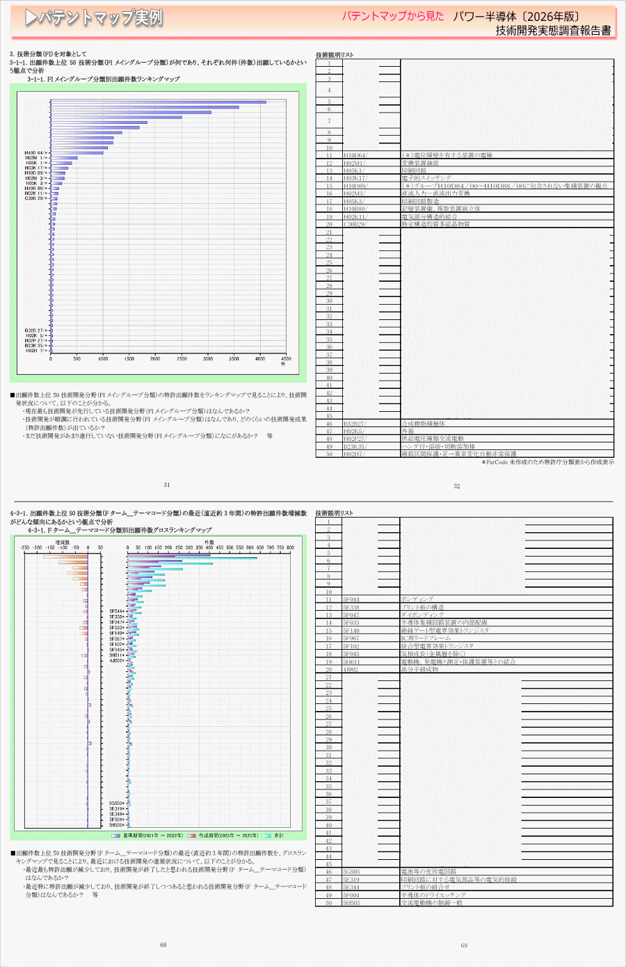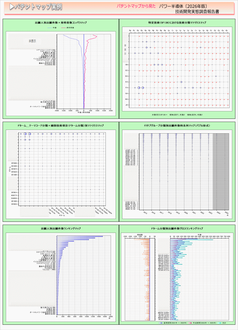「パワー半導体」に関する出願件数、出願人(共同出願人)、特許分類などに対し、ランキング、時系列推移、技術分布図など様々な観点から分析したパテントマップを作成し、技術開発の実態を把握し今後の開発の指針決定に役立てようとするものである。