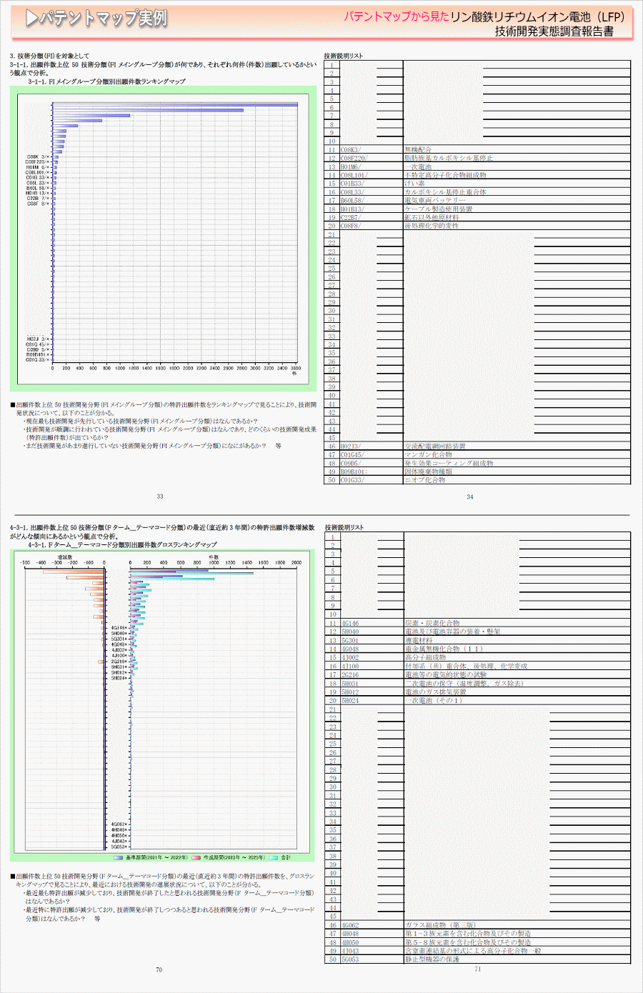 「リン酸鉄リチウムイオン電池(LFP)」に関する出願件数、出願人(共同出願人)、特許分類などに対し、ランキング、時系列推移、技術分布図など様々な観点から分析したパテントマップを作成し、技術開発の実態を把握し今後の開発の指針決定に役立てようとするものである。