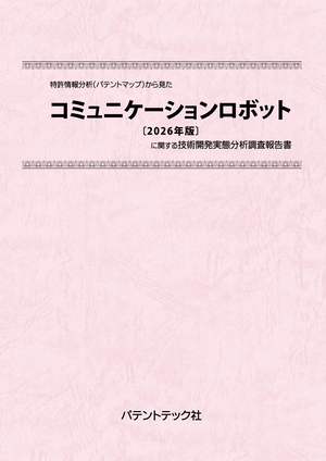 「コミュニケーションロボット」に関する出願件数、出願人(共同出願人)、特許分類などに対し、ランキング、時系列推移、技術分布図など様々な観点から分析したパテントマップを作成し、技術開発の実態を把握し今後の開発の指針決定に役立てようとするものである。