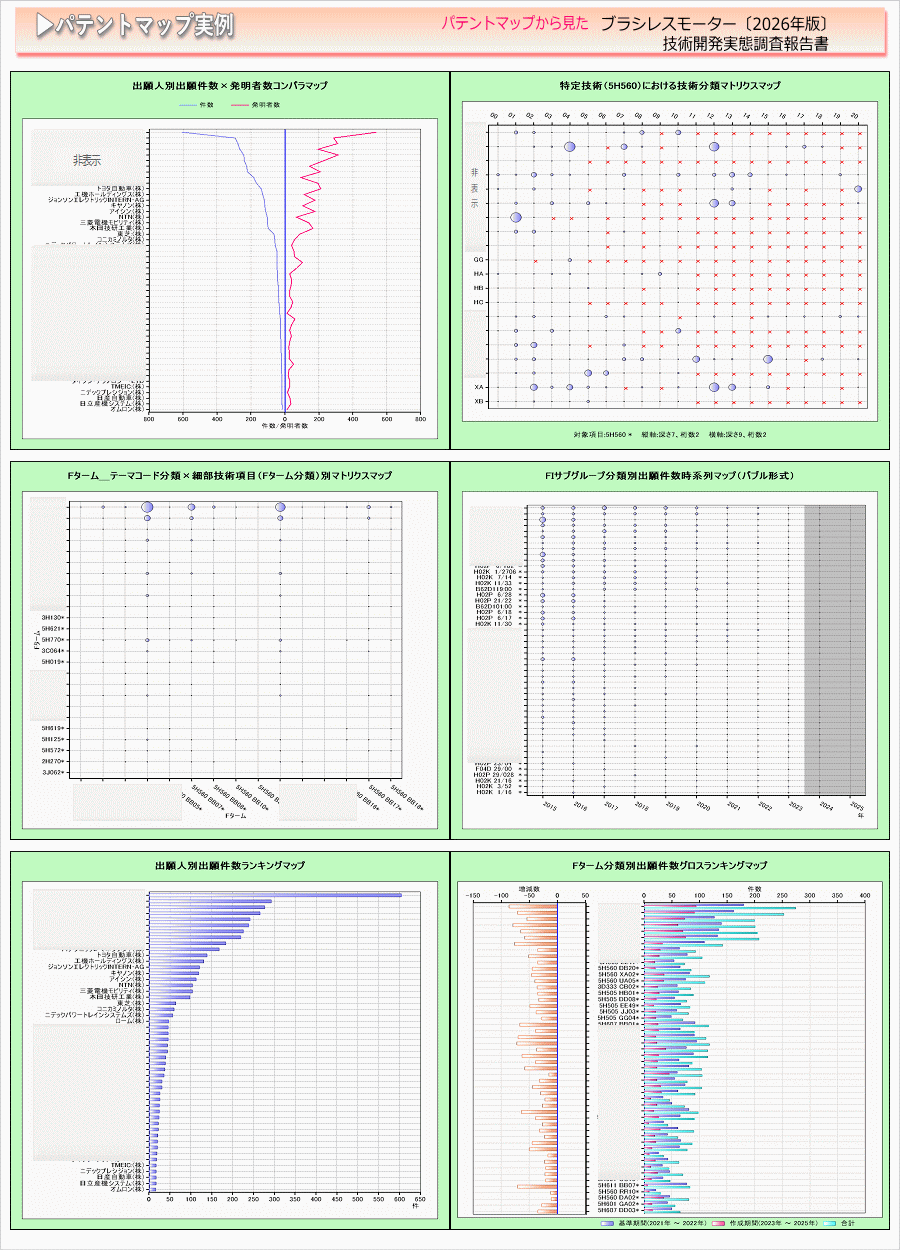 「ブラシレスモーター」に関する出願件数、出願人(共同出願人)、特許分類などに対し、ランキング、時系列推移、技術分布図など様々な観点から分析したパテントマップを作成し、技術開発の実態を把握し今後の開発の指針決定に役立てようとするものである。