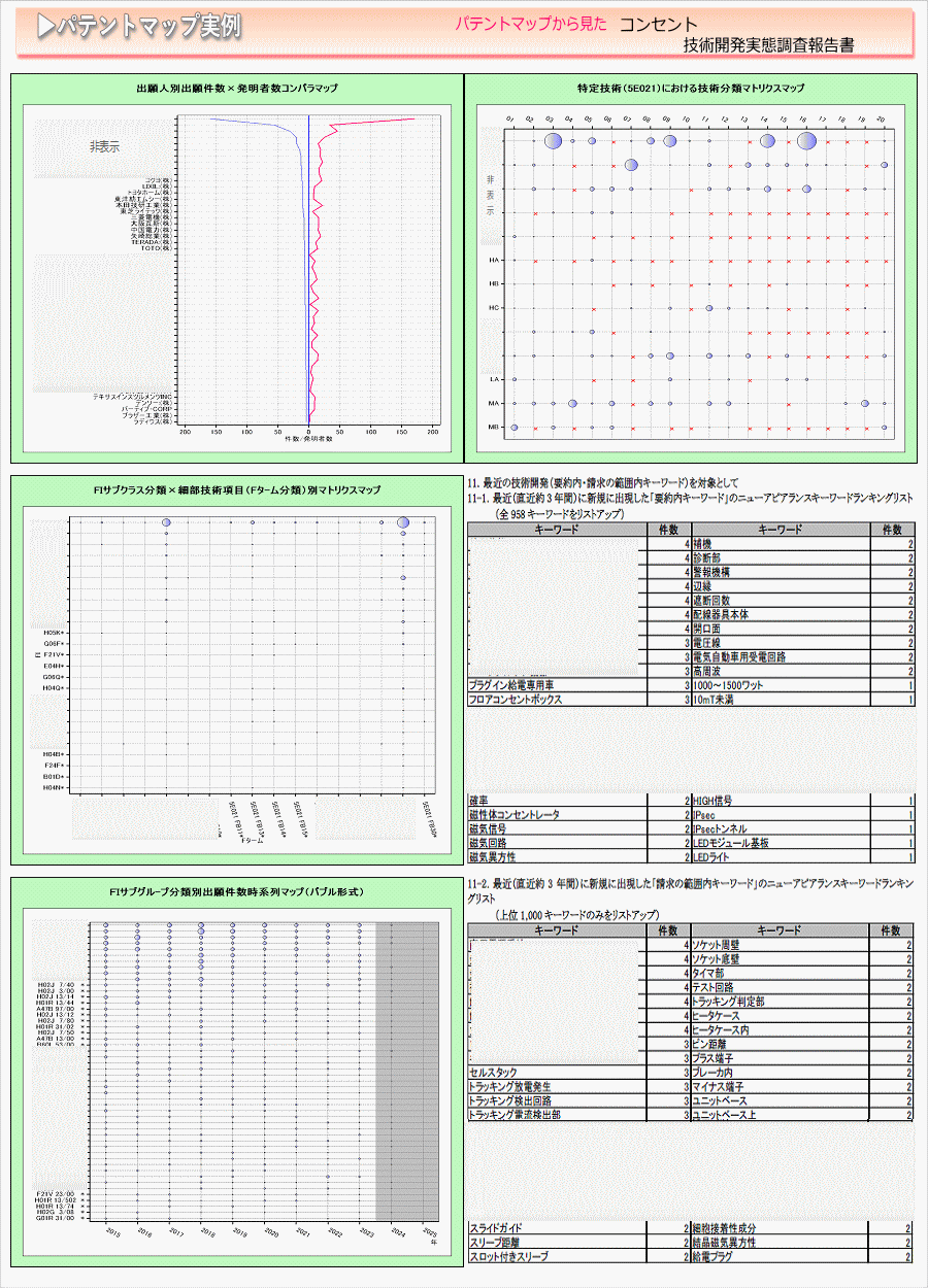 「コンセント」に関する出願件数、出願人(共同出願人)、特許分類などに対し、ランキング、時系列推移、技術分布図など様々な観点から分析したパテントマップを作成し、技術開発の実態を把握し今後の開発の指針決定に役立てようとするものである。